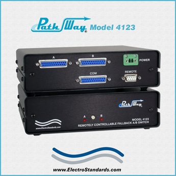The PathWay® Model 4145 Automatic Fallback and Recovery DB25 A/B Switch with Optional RS232 Remote Control allows the user the capability of sharing a single port interface device connected to the "COMMON" port among two other devices connected to the "A" and "B" ports, with remote access functionality. The Model 4145 is packaged in a slim desktop style enclosure.