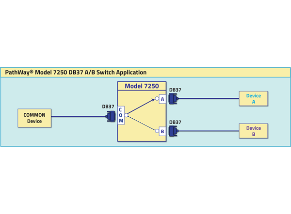 The PathWay® Model 7250 Single Channel DB37 A/B Switch allows the user the capability of sharing a single port interface device connected to the COMMON port among two other devices connected to the "A" and "B" ports. The Model 7250 is packaged in a slim desktop style enclosure.