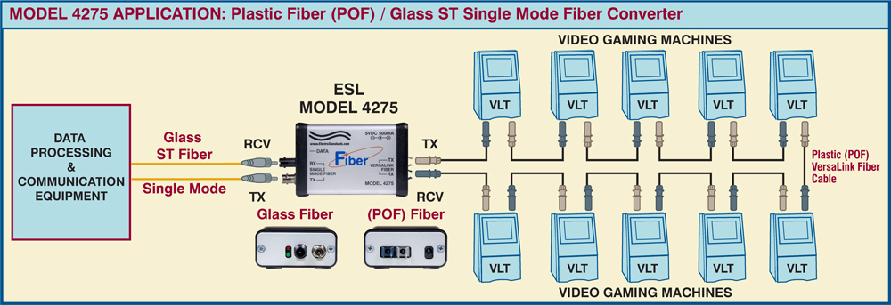 The drawing illustrates Data Processing or Communication Equipment connected to the ST Single Mode fiber connector of the Model 4275. The Plastic Optical Fiber Connector is linked to Video Gaming Machines via Plastic Optical Fiber cabling. The Model 4275 application may include Industrial Networks linking Machines or Robotic Equipment