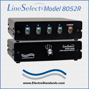 The LineSelect® Model 8052 enables access to four Cat6 RJ45 networks from one COMMON RJ45 device. The Model 8052 A/B/C/D Switch allows the user to reroute data between four networks with a simple flip of a switch. No need to plug and unplug cables thereby eliminating connector wear. The unit supports all eight pins of the RJ45 Cat6 interface. Since the switch supports all eight pins, it is applicable to sharing ANY RJ45 device.