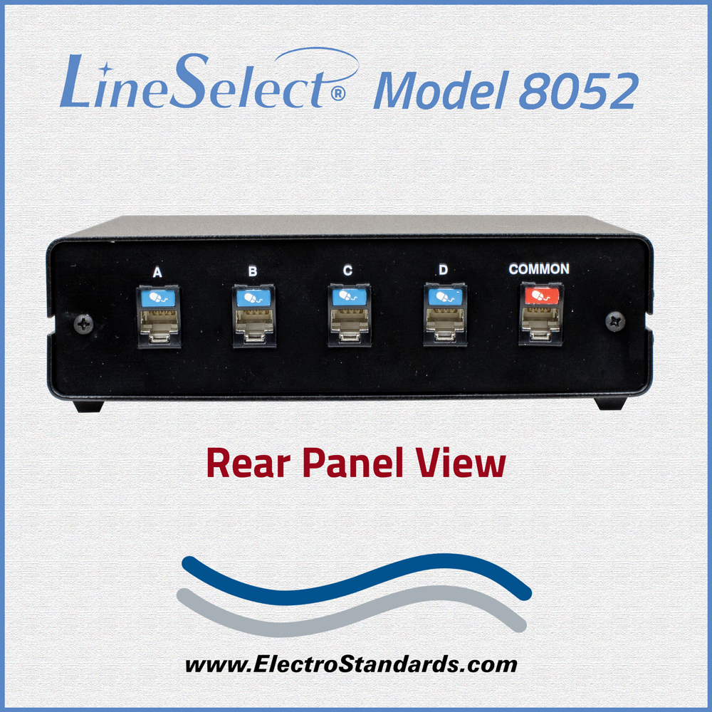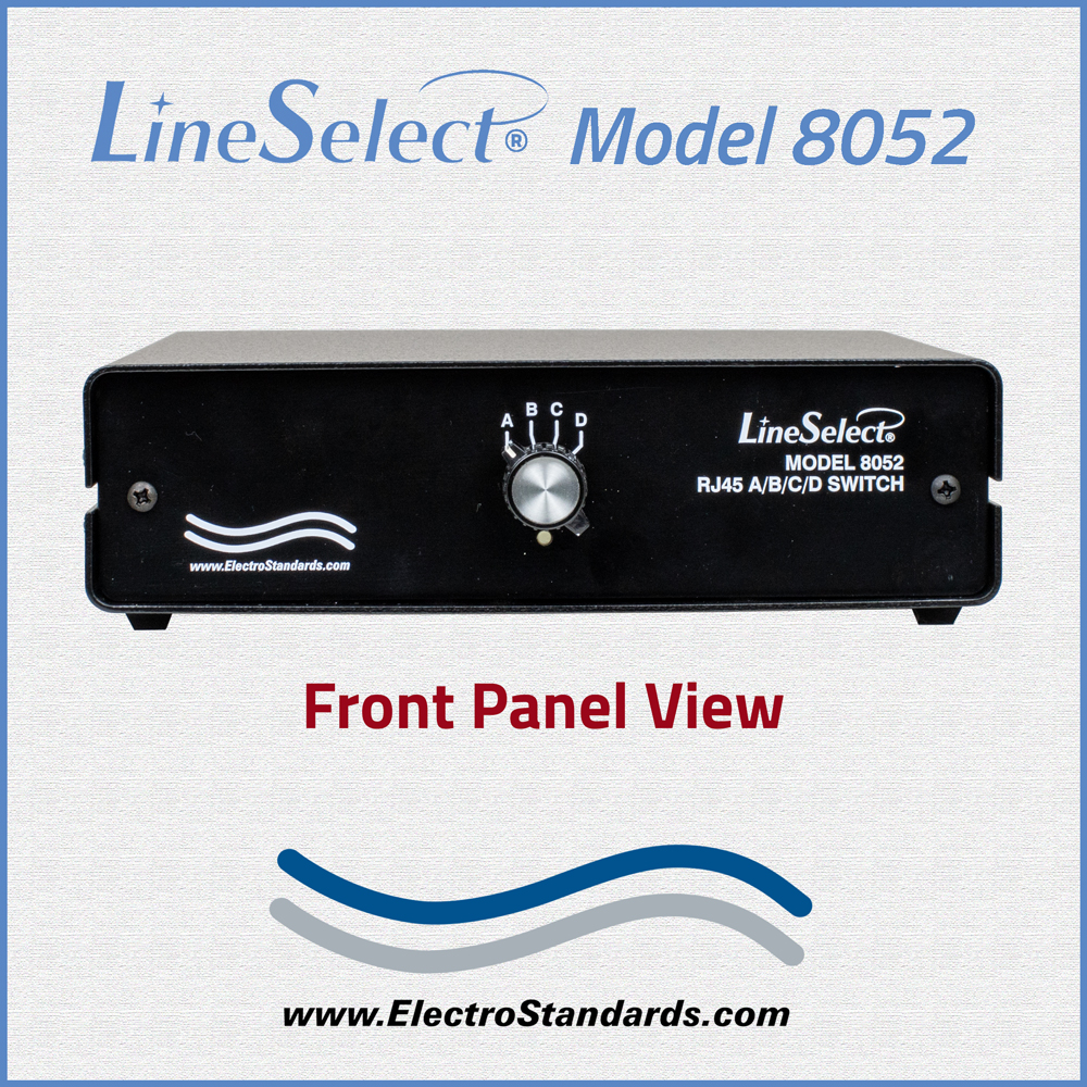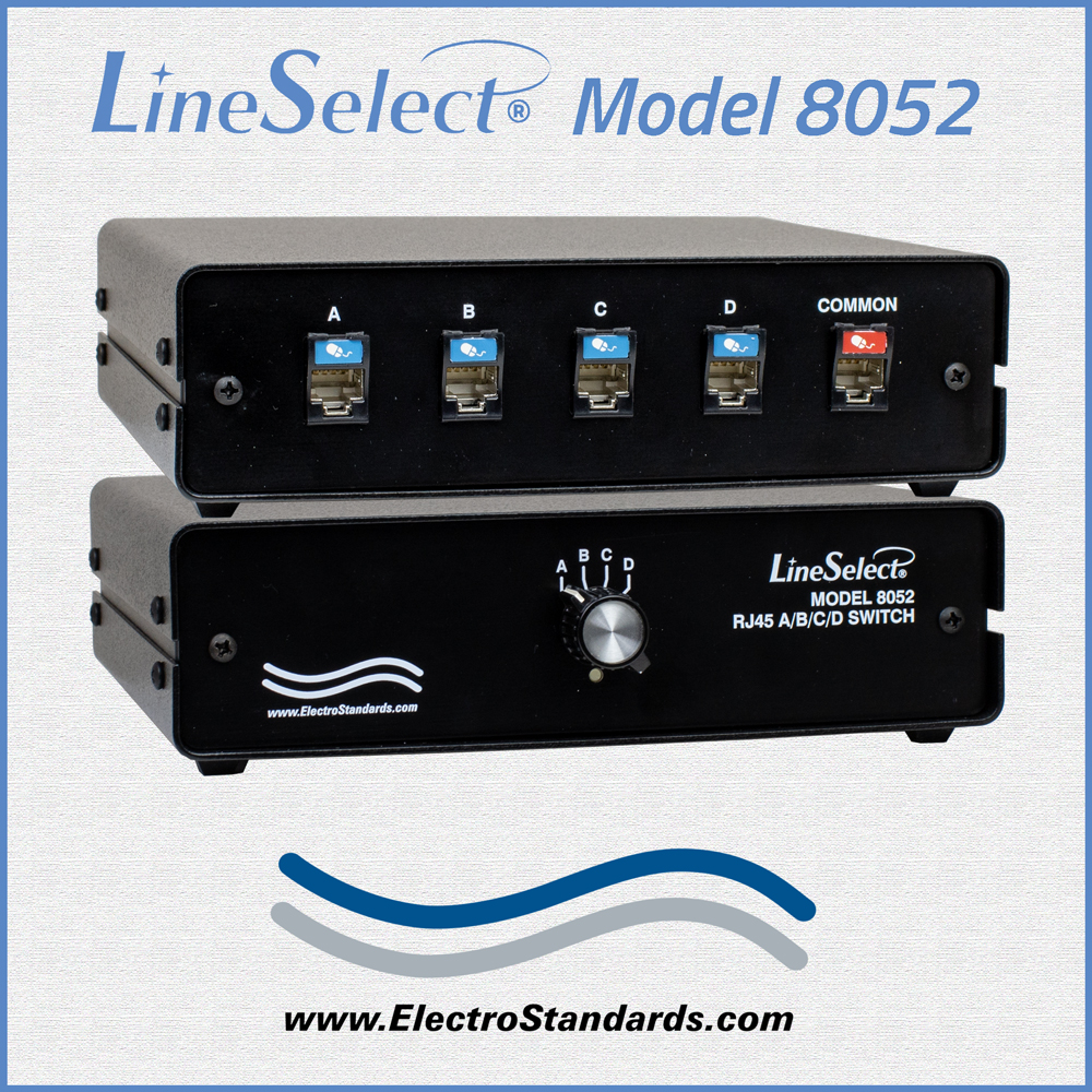 The LineSelect® Model 8052 enables access to four Cat6 RJ45 networks from one COMMON RJ45 device. The Model 8052 A/B/C/D Switch allows the user to reroute data between four networks with a simple flip of a switch. No need to plug and unplug cables thereby eliminating connector wear. The unit supports all eight pins; it is applicable to sharing ANY RJ45 device.