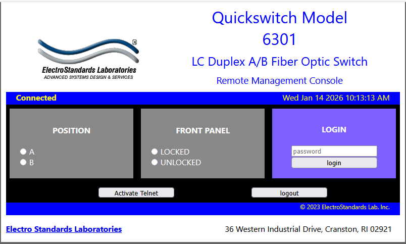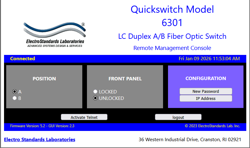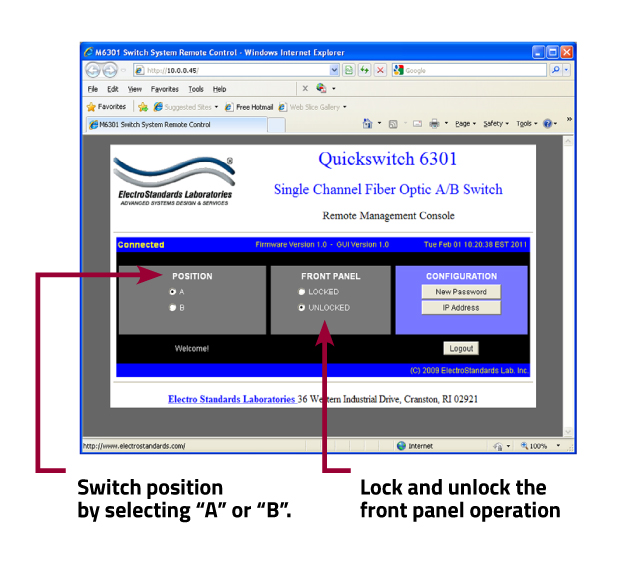 - Remote Control Telnet Command Interface that allows the user to control switch position, lockout front panel operations, obtain switch status, as well as query firmware version, query serial number and enable/disable autosend of switch positions.