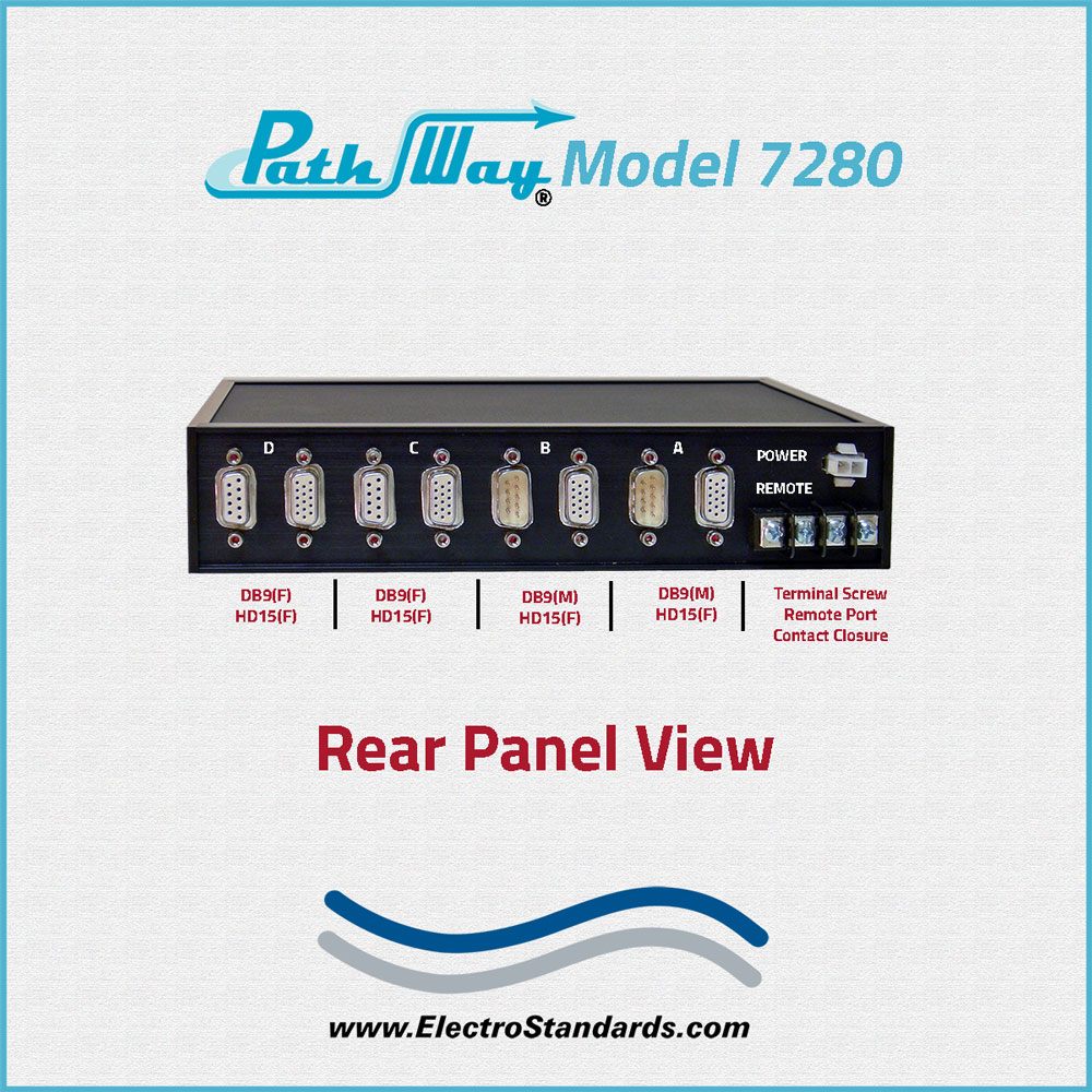 The PathWay® Model 7280 HD15 (VGA) and DB9 Video Crossover toggle network switch with remote contact control allows two pairs of compatible devices to exchange interconnections. The Model 7280 network switch can be manually controlled via the front panel toggle switch or remotely controlled via the rear panel screw terminal Remote port. The remote port screw terminal supports 14/16 AWG wiring.