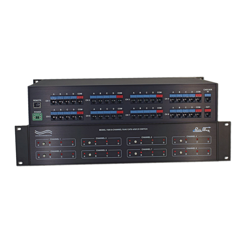 The PathWay® Model 7320 8-Channel RJ45 Cat6 A/B/C/D Switch with Telnet, GUI, and Cascade Operation allows the user the capability of sharing a single port RJ45 interface device, connected to the "COMMON" port, among four other devices, connected to the A, B, C, and D ports, for each channel. The Model 7320 is enclosed in a 2U, full rack size, all metal black chassis designed to provide EMI/RFI shielding and fit in a standard 19" rack.