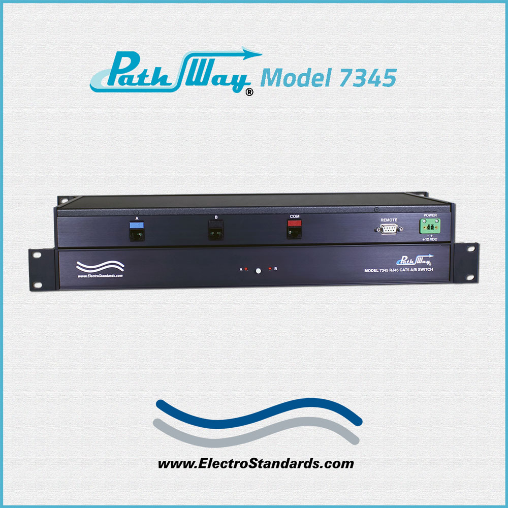 The PathWay® Model 7345 RJ45 Cat5 A/B Switch with RS232 Remote allows users to connect a workstation or device between two other devices or networks. The switch employs an RJ45 Cat5 connector interface on ports A, B, and Common. A front panel pushbutton allows the user to select the switch position. LED indicators on the front panel display the switch position. The Model 7345 is enclosed in a 1U, full rack size, all metal, black chassis designed to provide EMI/RFI shielding and fit in a standard 19” rack.