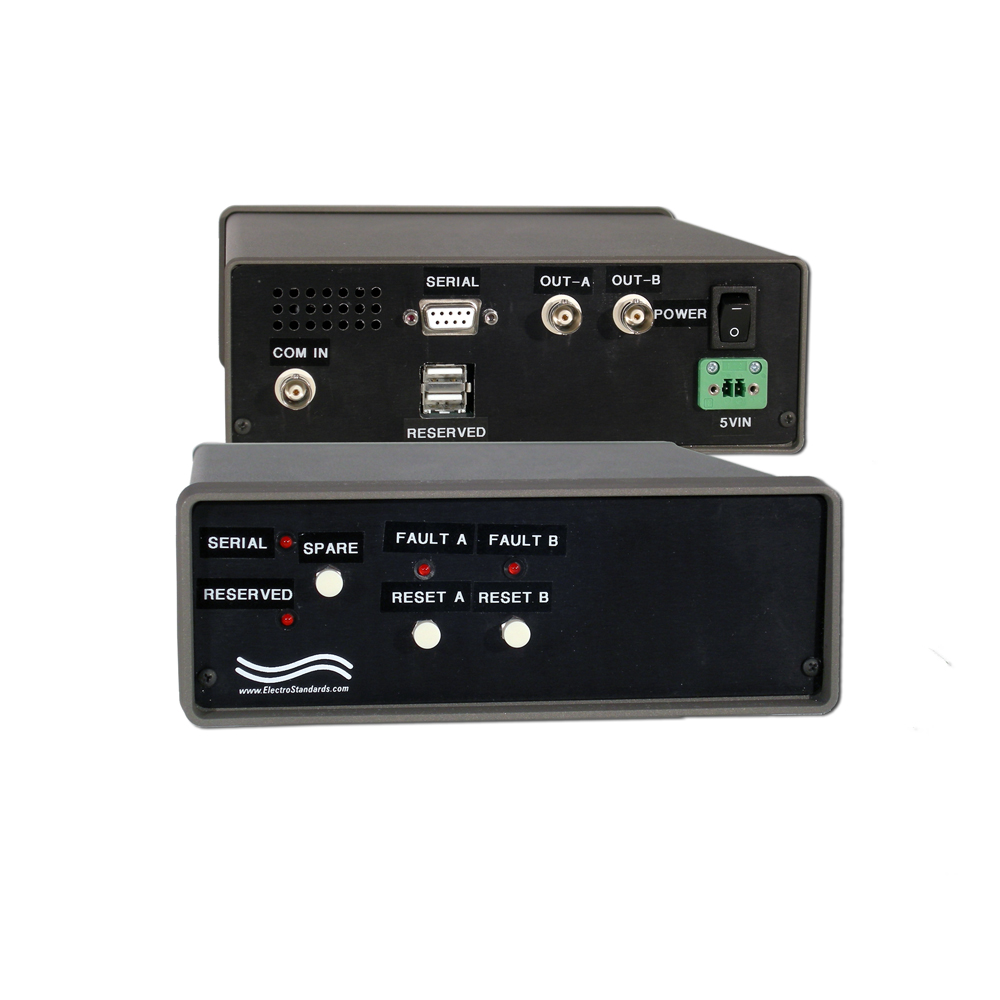 - PORT CONNECTORS: (3) BNC(F) connectors labeled COM-IN, OUT-A, and OUT-B