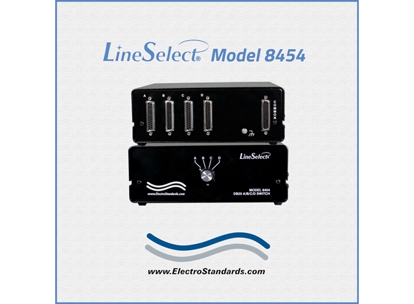 The LineSelect® Model 8454 DB25 THX Audio Interface A/B/C/D Switch allows the user to reroute data between any one of four DB25 devices to one COMMON device with the simple rotation of a selector switch. All 25 pins of the DB25 interface are switched. No need to plug and unplug interconnection cables thereby eliminating connector wear and/or errors when reconfiguring system connections. The LineSelect® Model 8454 is packaged in a compact desktop style enclosure.