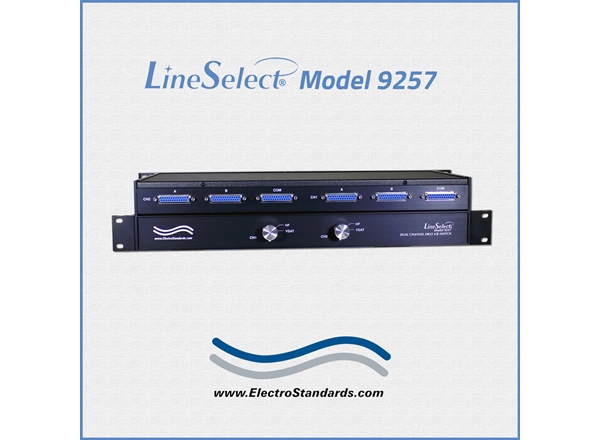 The LineSelect® Model 9257 RS530 DB25 A/B Switch allows the user to access two DB25 interface devices connected to its A and B ports with one DB25 interface device connected to its COMMON port, for each channel. Independent switching of each of the two channels is accomplished via the two knobs located on the front panel. The LineSelect® Model 9257 is enclosed in a 1U, full rack size, all metal, black chassis designed to provide EMI/RFI shielding and fit in a standard 19" rack.
