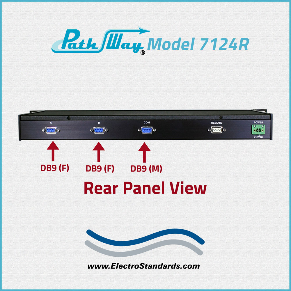 The PathWay® Model 7124R DB9 A/B Automatic Fallback switch with Contact Closure Remote Port allows the user the capability of sharing a single port interface device connected to the "COMMON" port among two other devices connected to the "A" and "B" ports with remote control access functionality.