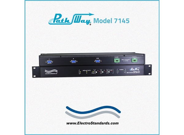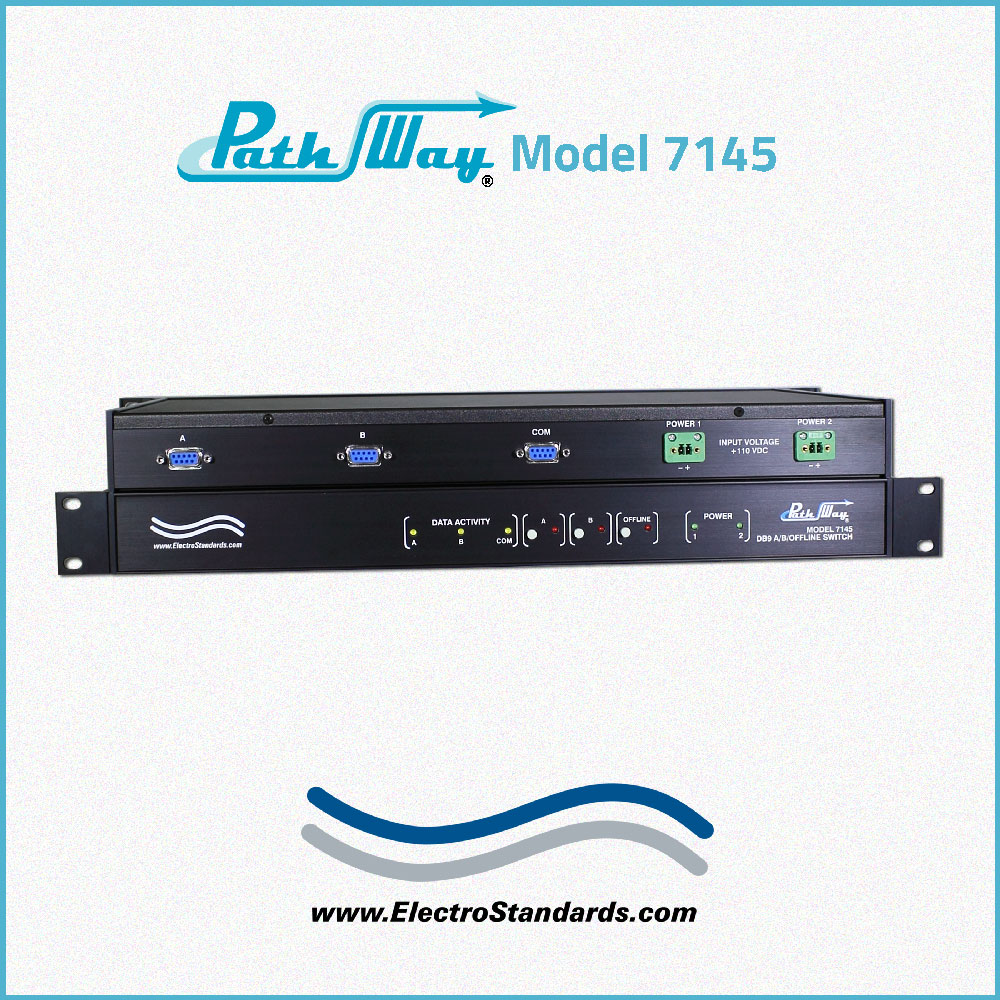 The PathWay® Model 7145 DB9 Automatic Sensing DB9 A/B/OFFLINE Switch with Special Redundant Input Power System allows the user the capability of sharing a single port interface device connected to the COMMON port among two other devices connected to the A and B ports, with remote access functionality. The Model 7145 is packaged in a slim, 1U rack height rack mount enclosure. The switch may be controlled locally by manually operating the front panel pushbuttons. The front panel LED display indicates the switch position, data activity and unit power status.