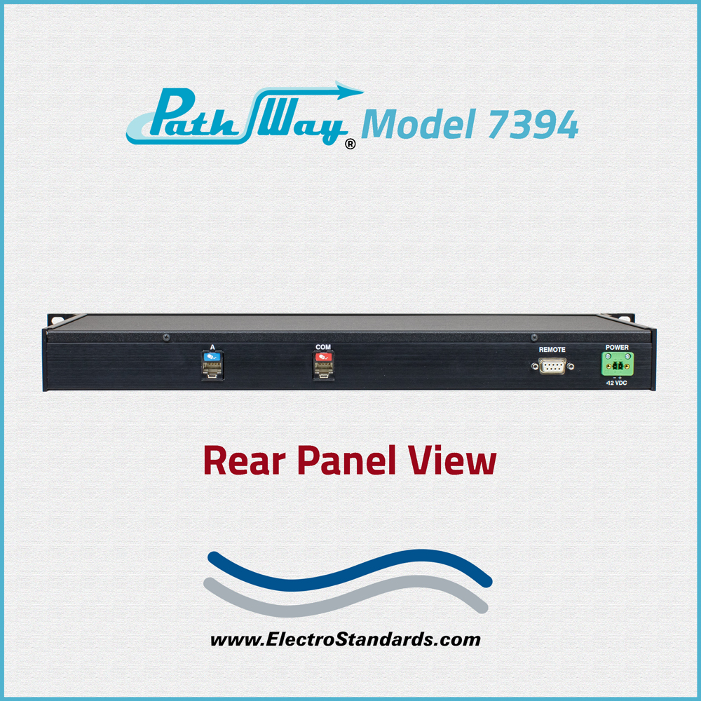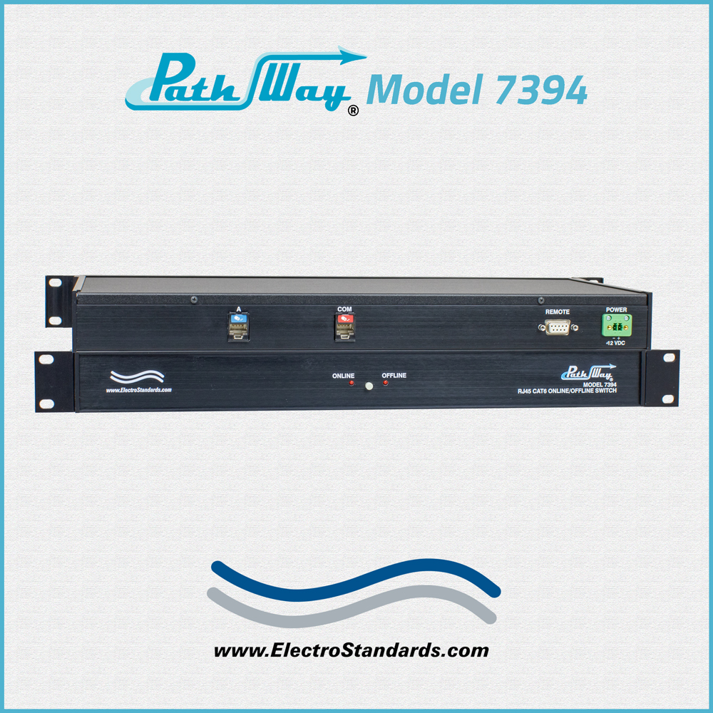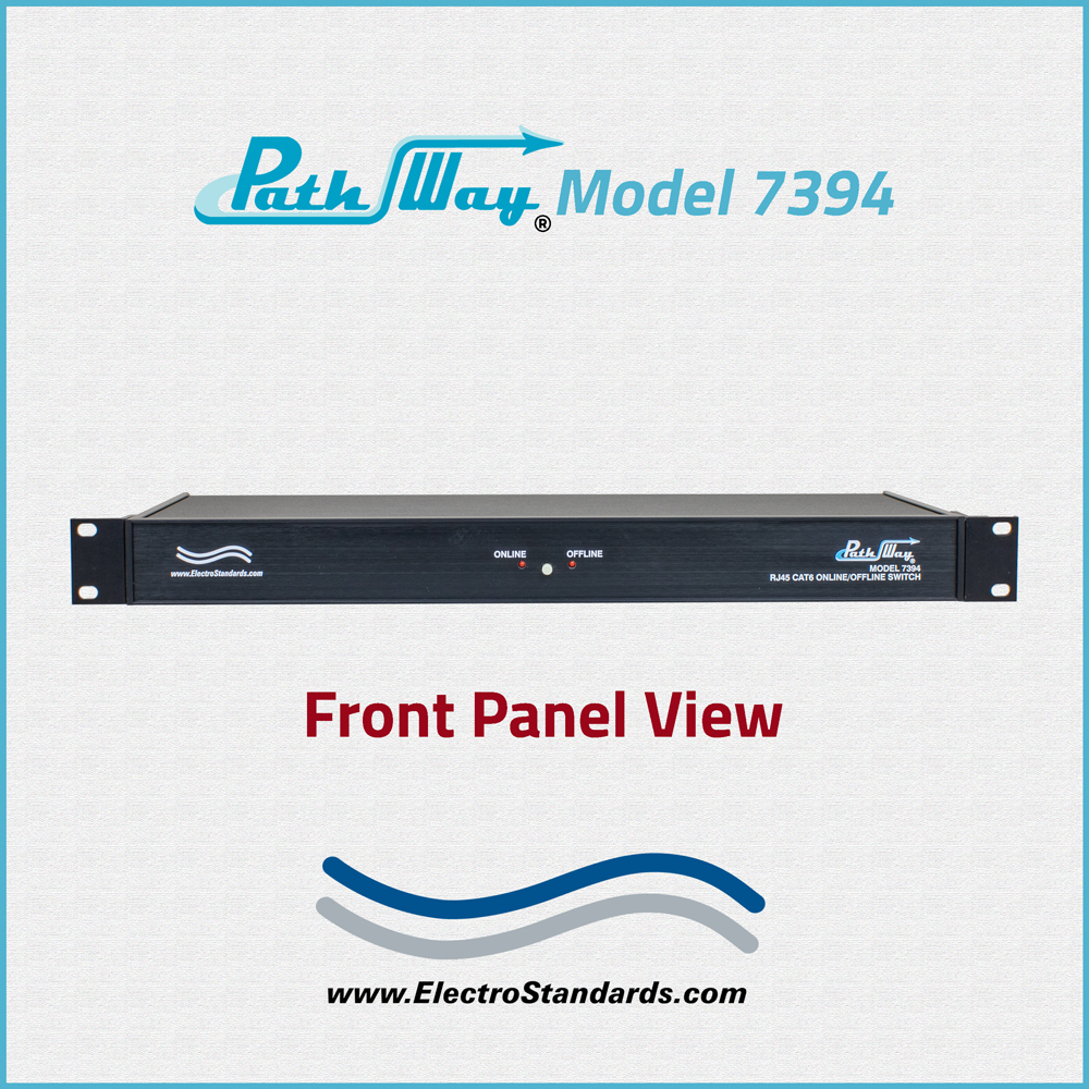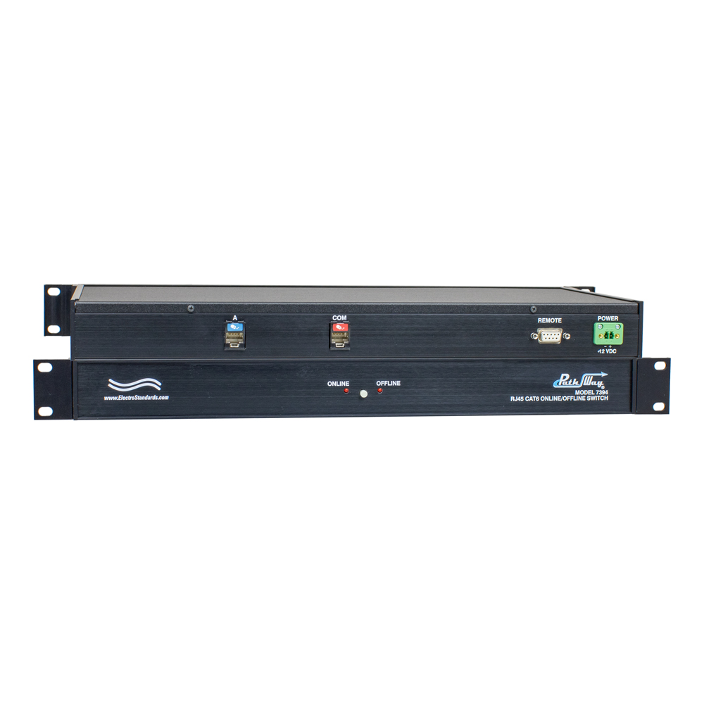 The PathWay® Model 7394 RJ45 Cat6 Online/Offline Switch with Contact Closure Remote allows the user the capability of connecting two separate devices, ports A and COM, via an Online or Offline connection. The Model 7394 is enclosed in a 1U, full rack size, all metal, black chassis designed to provide EMI/RFI shielding and fit in a standard 19” rack.