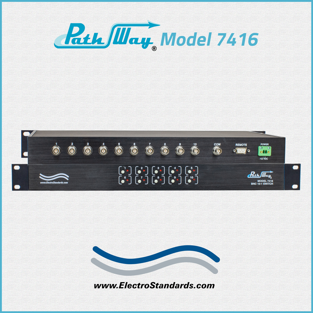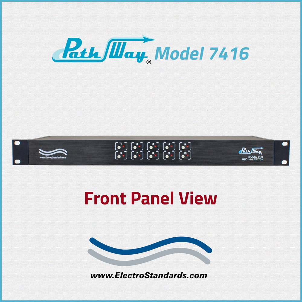 The PathWay® Model7416 Remotely Controllable BNC interface 10- 1 Switch allows the user the capability of sharing a single BNC interface device connected to the common port among 10 other devices connected to ports 1-10. The Model 7416 is packaged in a slim rackmount enclosure. The switch may be controlled manually via front panel pushbuttons or remotely from an RS232 serial port located on the rear of the unit. Switch position status may be attained via the front panel LED display of the remote control RS232 serial port located on the rear of the unit.
