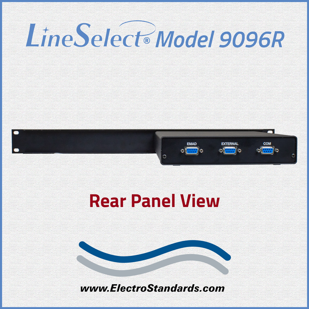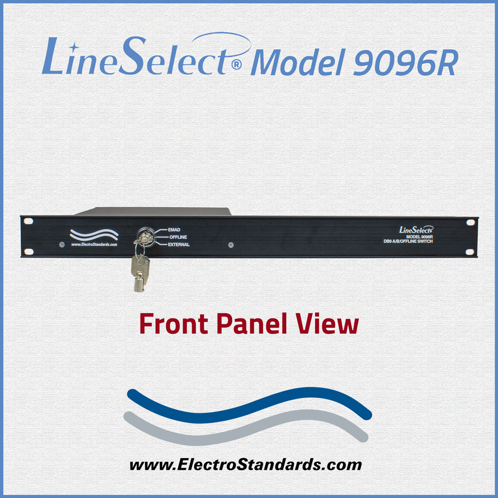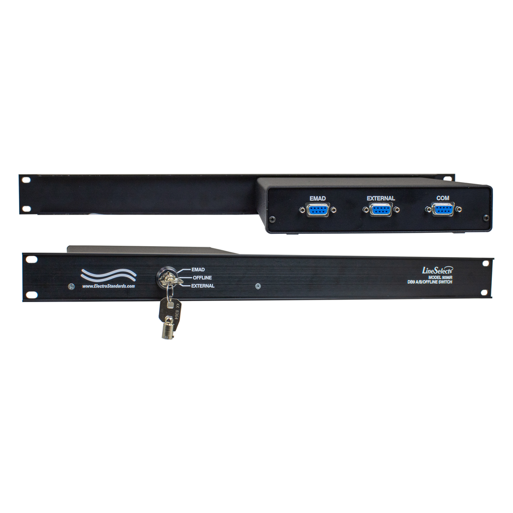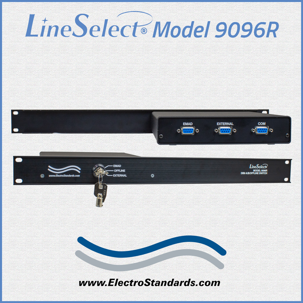 The LineSelect® Model 9096 DB9 EMAD/OFFLINE/EXTERNAL (A/B/C) Switch allows the user to access two DB9 devices connected to its A (EMAL), and C (EXTERNAL) ports and one “OFFLINE” (B) port, connected by one DB9 device connected to its COMMON port. The unit is manually operated, requiring no power. Port selection is quick and easy via front panel keylock, with the key being removable in the Offline position. The LineSelect® Model 9096R is enclosed in a desktop size enclosure with a 1U full rack size front panel, and an all metal chassis designed to provide EMI/RFI shielding and fit in a standard 19” rack.