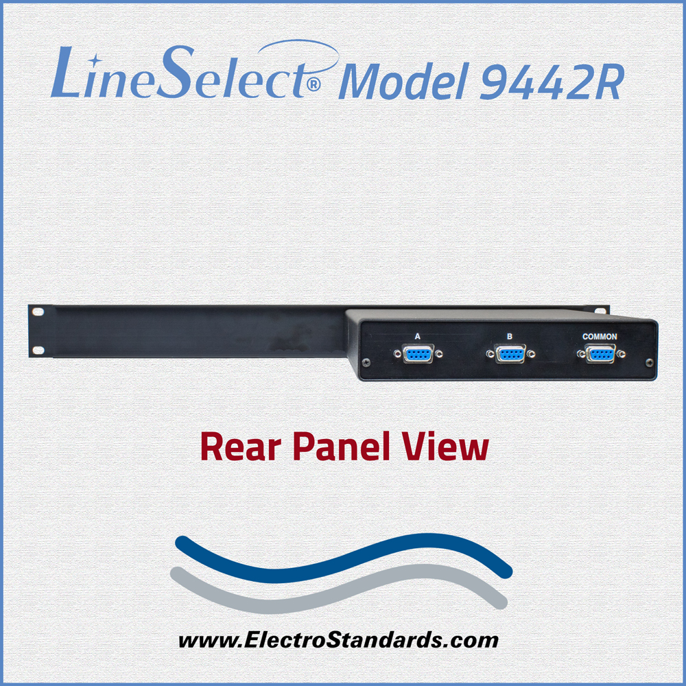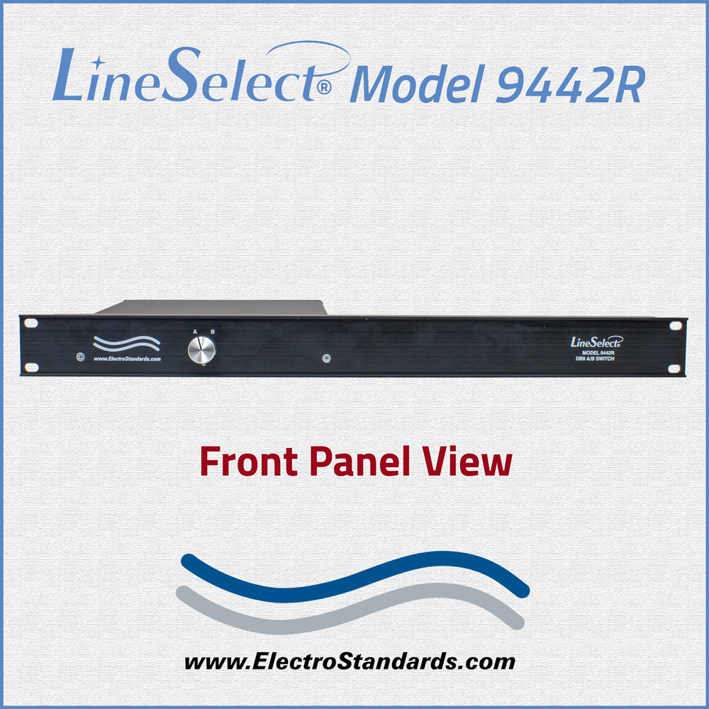 The LineSelect® Model 9442R Single Channel DB9 A/B Switch allows the user to switch COMMON equipment to either A or B ports with a simple turn of a rotary switch knob. The unit supports all 9 pins of the DB9 interface. No need to plug and unplug cables, thereby eliminating connector wear. The LineSelect® Model 9442R is enclosed in a desktop size enclosure with a 1U full rack size front panel, and an all metal black chassis designed to provide EMI/RFI shielding and fit in a standard 19" rack.