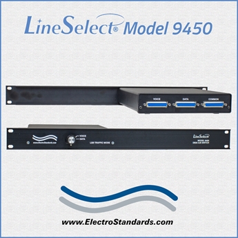 The LineSelect® Model 9450R Single Channel DB25 VOICE/DATA A/B Switch allows the user to switch COMMON equipment to either VOICE or DATA ports with a simple turn of a rotary switch knob. The unit supports all 25 pins of the DB25 interface. No need to plug and unplug cables, thereby eliminating connector wear. The LineSelect® Model 9450R is enclosed in a desktop size enclosure with a 1U full rack size front panel, and an all-metal black chassis designed to provide EMI/RFI shielding and fit in a standard 19" rack.