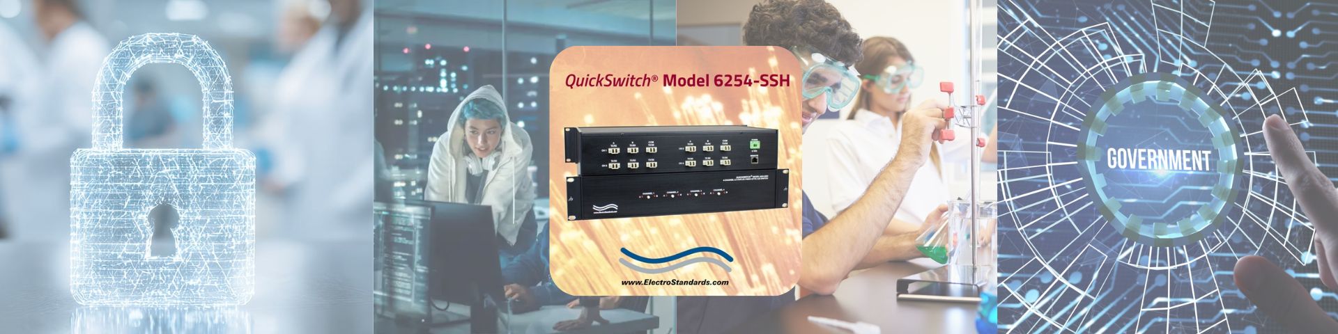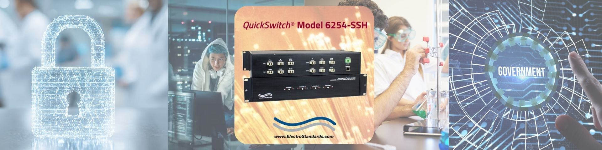 Electro Standards Laboratories (ESL) adds Model 6254-SSH to its lineup of QuickSwitch ® secure fiber optic switches. The Model 6254-SSH is an LC duplex fiber optic switch designed for secure, remote management of fiber connections for switching or sharing A / B positions for up to four networks or devices. The Model 6254-SSH allows users to switch fiber channels between A and B network paths remotely using a secure, password protected SSH or HTTPS web-based interface or manually controlling using front panel pushbuttons.