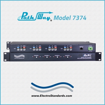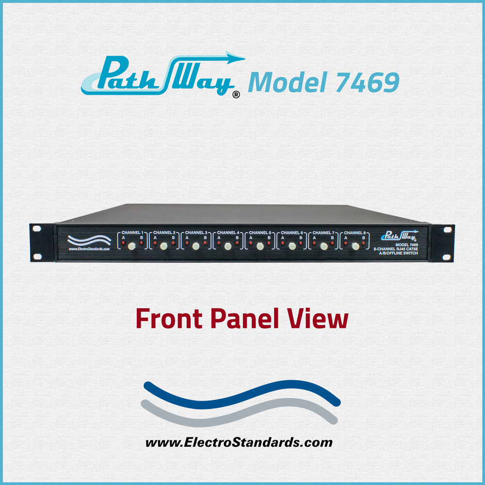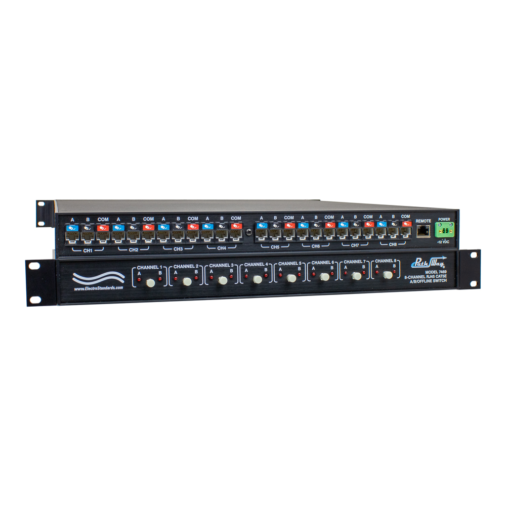 The PathWay® Model 7469 8-Channel RJ45 Cat5e A/B/OFFLINE Switch with Telnet and GUI allows the user the capability of sharing a single port interface device connected to the COMMON port, among two other devices connected to the A and B ports for each channel. Remote Control access can be accomplished using an Ethernet 10/100 Base-T connection and either Telnet Commands or Graphic User Interface. The Model 7469 is enclosed in a 1U full rack size, black all metal chassis designed to provide EMI/RFI shielding and fit in a standard 19" rack.